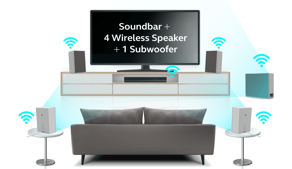 情境:Soundbar 放在電視下方,2 個無線音響放在Soundbar的左右兩側,另外 2 個無線音響分別放在沙發後面,低音喇叭則放在電視的兩側地面上。