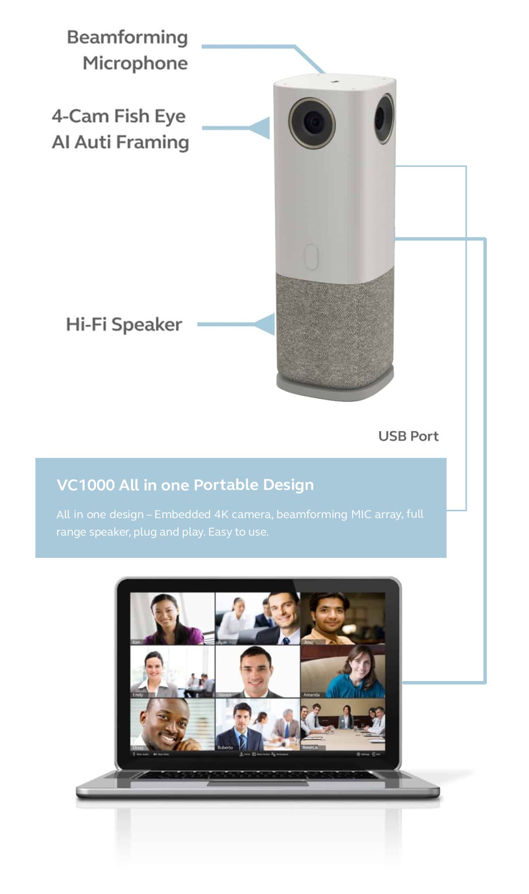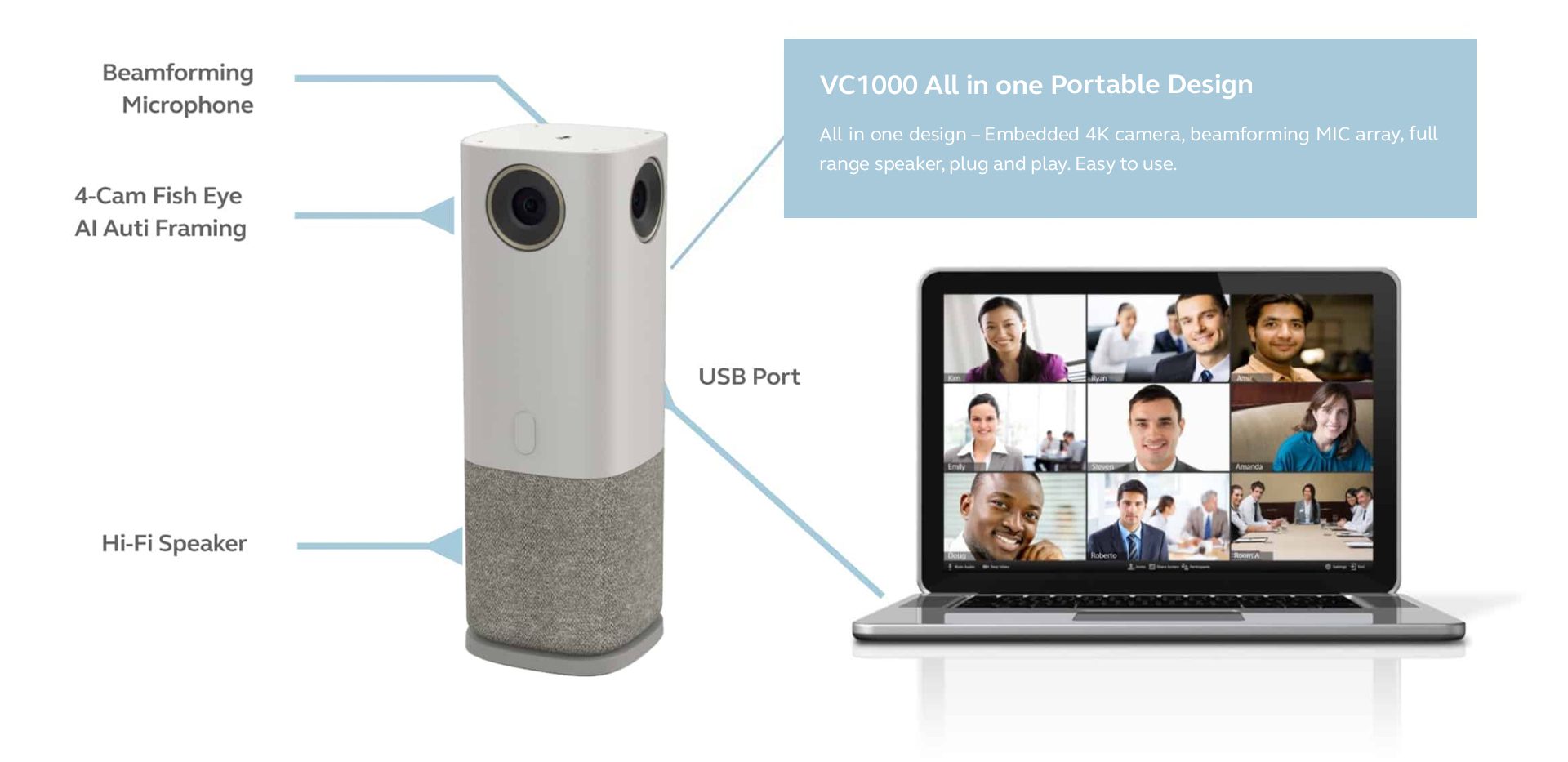 The disrupted AI video conference speaker VC1000, combines multiple functions in one portable device with stanning efficiency. Auto Face detection and voice tracking brings a brand new 360° omnidirectional video conference experienceShortening the distance of regions, brings all angles in the room with ease.