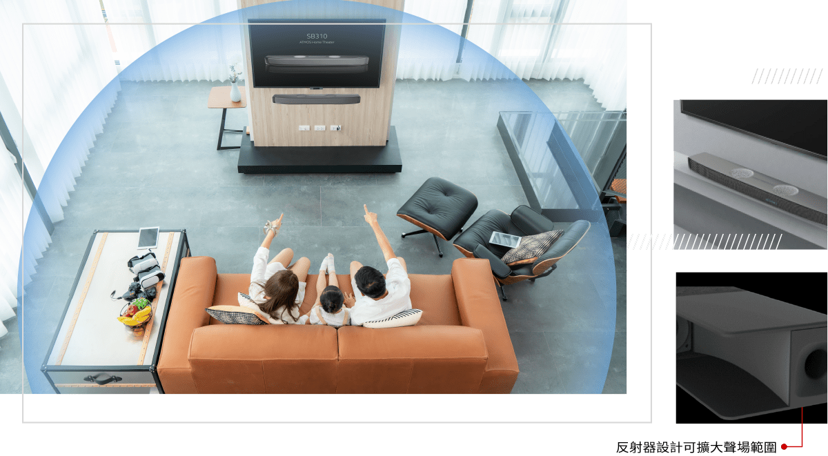 淇譽電子以其獨特的聲學技術表現了 SB310 ATMOS soundbar的環繞音場。